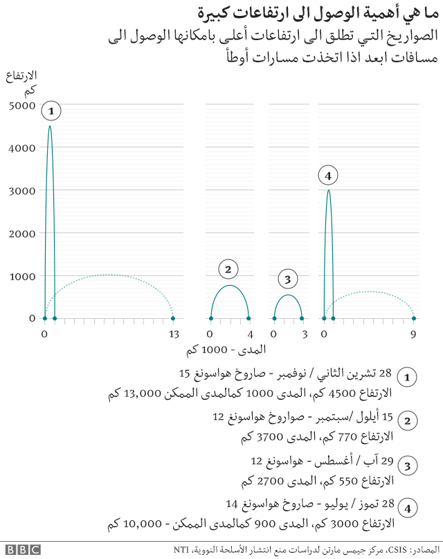 وقالت كوريا الشمالية الأربعاء إن الصاروخ الذي أطلقته بلغ ارتفاعا قدره 4475 كيلومترا، وهو ارتفاع أعلى من محطة الفضاء الدولية بعشر مرات، وإنها كان يحمل رأسا حربية قادرة على ضرب أهداف في الأرض.